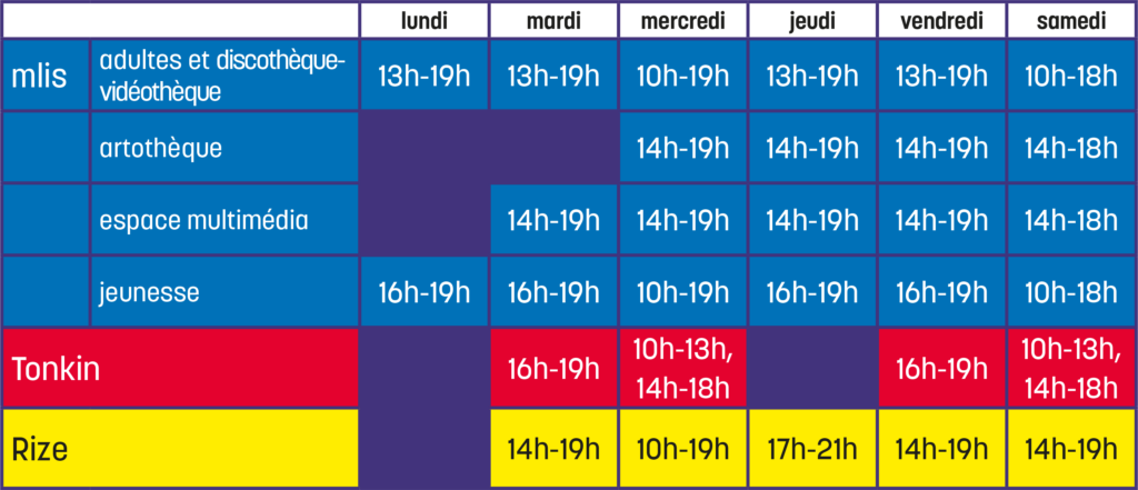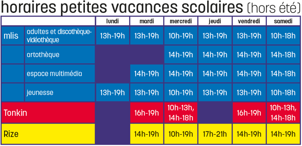 | – La Maison du livre, de l’image et du son est fermée lundi 27 avril et les services adaptent leurs horaires autour de la Fête du livre jeunesse – cliquez ici pour plus de détails – Le service disco-vidéo de la Mlis (4è étage) ouvre à 16h (au lieu de 13h) les mardis 28 avril et 19 mai. - La médiathèque du Tonkin est fermée du mardi 19 au samedi 23 mai pour travailler sur le projet de la nouvelle médiathèque. |