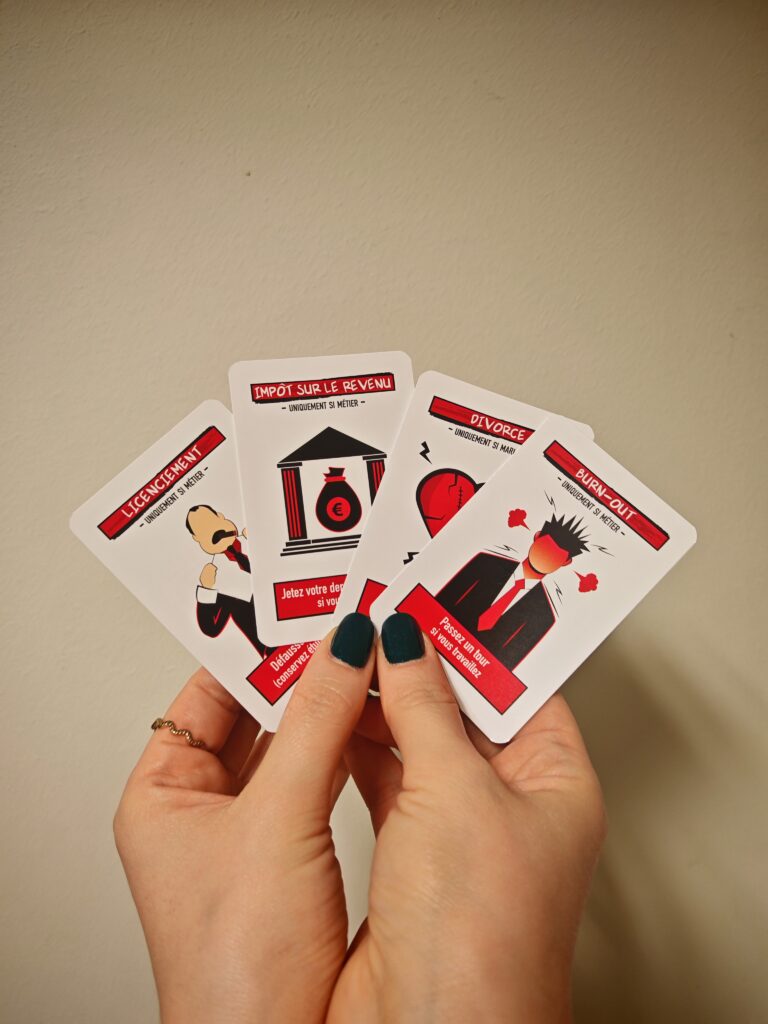 Mais les autres joueurs peuvent venir perturber votre trajectoire : accident, licenciement, rupture, burn-out… Heureusement, des cartes “bonus” permettent aussi de se protéger ou de rebondir. Le hasard, les choix et les interactions font toute la richesse du jeu.