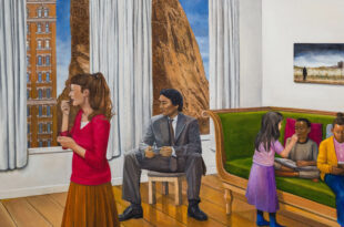 Andrew Lewis investit le mur courbe de l’artothèque avec 23 œuvres, essentiellement de grand format, peintures à l’huile et dessins au fusain, qui se lisent comme un travelling spatio-temporel.